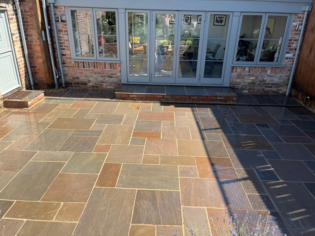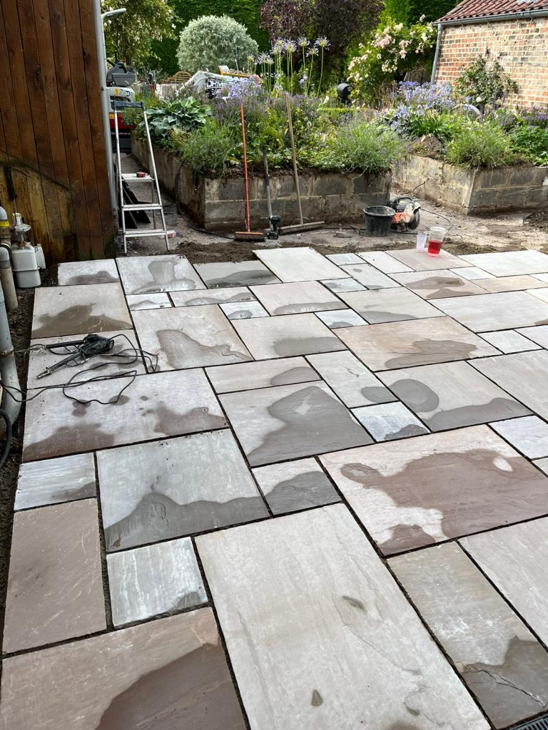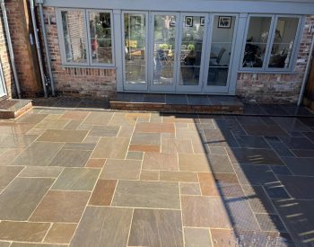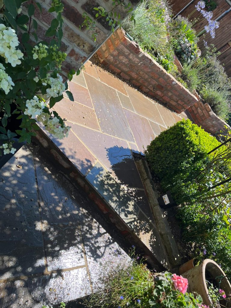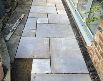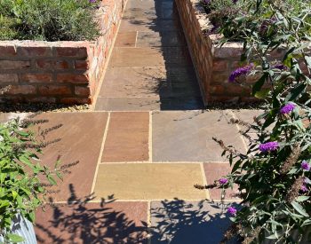 Our team undertook the project of replacing the timber cladding and decking with ‘Indian Stone’ Paving stone and rebuilding the walls to the raised beds using bricks to match the residential dwelling and and finishing with a “Indian Stone’ coping stone to complete the look. The existing purple slate chip path was replaced with ‘Indian Stone’ Paving to create a safer/easier surface to walk on.