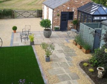 We were asked to design and landscape a cottage garden, it had to be low maintenance and meet the following requirements! 1.) a lawn area to break up the hard landscaping 2.) driveway suitable for two cars to park 3.) An access path from the cottage to the sun room & garage area 4.) Be suitable and practical for dogs to play in 5.) All same level. The result was as follows, We installed a lawn area using artificial turf, As this is practical, low maintenance and looks great all year round. The driveway was constructed out of block paving using a buff coloured sett with a charcoal edging to create a border around the parking area, we think that the colours of the paving setts complimented the brick garage and the patio area stone well, The charcoal sett looked fabulous and was enhanced by the graphite grey paint on the garage and summer house doors/windows. The access path from the rear of the cottage to the garage was created using the indian stone flags saved/recycled from the existing patio area. The indian stone was laid in a random pattern with a gravel border. The gravel, artificial turf and planting introduced texture and additional colour to the garden.